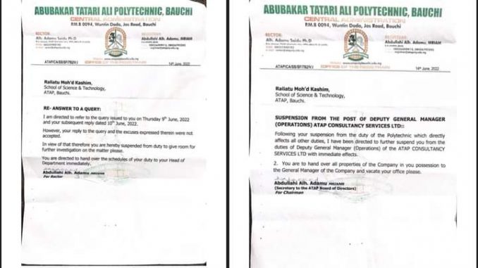 Her letter of suspension dated June 14 and signed by the registrar of institution, Abdulahi Adamu read, “Following the suspension from the duty of the Polytechnic which directly affects all other duties. I have directed to further suspend you from the duties of Deputy General Manager (Operations) of the ATAP CONSULTANCY SERVICES LTD with immediate effects.