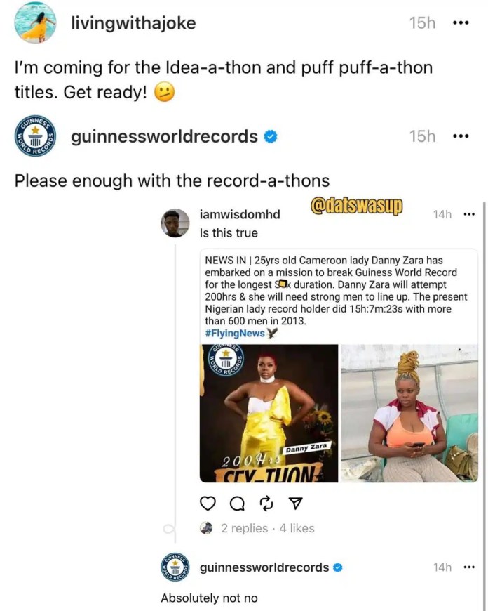 The 200-hour sex marathon attempt by a Cameroonian woman has prompted a response from Guinness World Records.