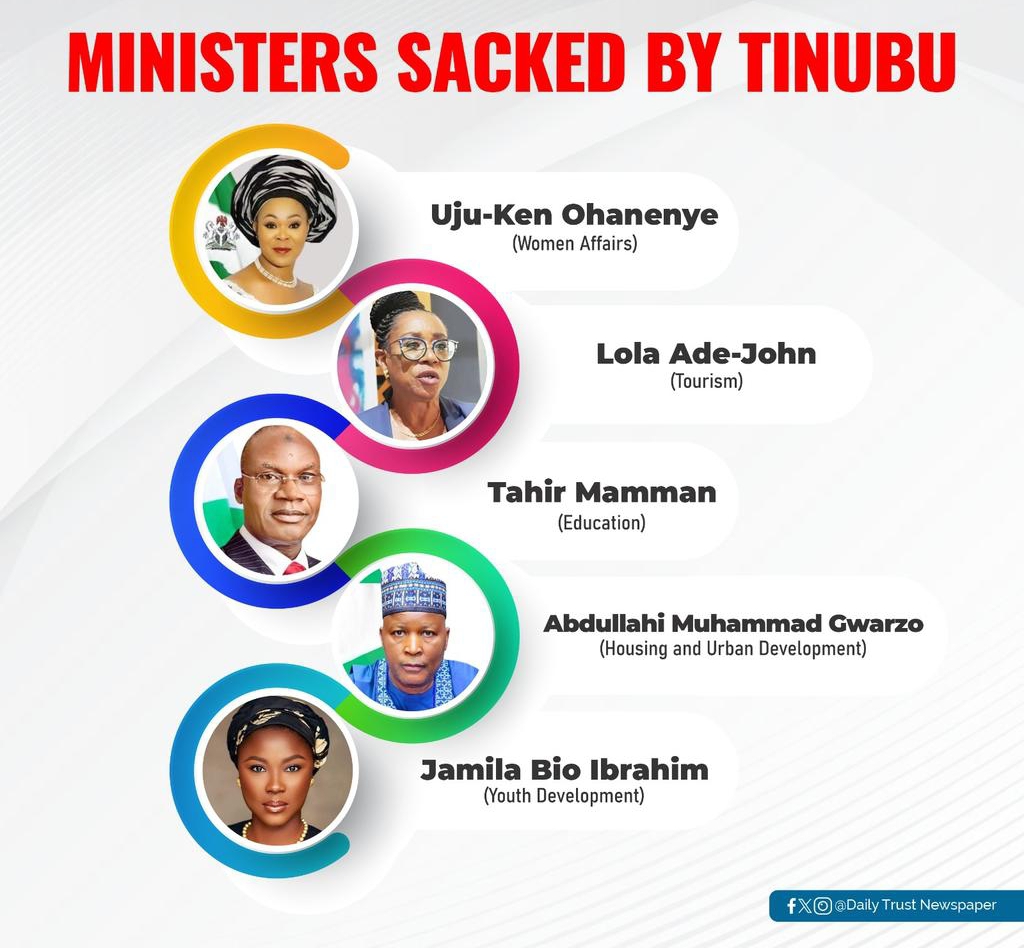 The Ministers that were relieved from the cabinet were Prof. Tahir Mamman, (Education), Uju Kennedy Ohanenye (Women Affairs), Mohammed Gwarzo (State for Housing), Jamila Ibrahim (Youth Development), Lola Ade-John (Tourism) and the suspended Minister of Humanitarian Affairs, Betta Edu, who has been replaced.