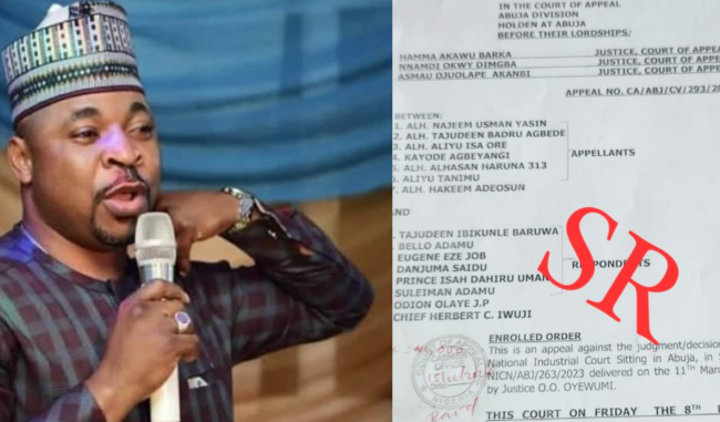 In the Appeal numbered CA/ABJ/CV/293/2024 between Alh. Najeem Usman Yasin, Alh. Tajudeen Badru Agbede, Alh. Aliyu Isa Ore, Kayode Agbeyangi, Alh. Alhasan Haruna 313, Aliyu Tanimu, Alh. Hakeem Adeosun as 1st to 7th Appellants and Tajudeen Ibikunle Baruwa, Bello Adamu, Eugene Eze Job, Danjuma Saidu, Prince Isah Dahiru Uman, Suleiman Adamu, Odion Olaye J.P and Chief Herbert C. Iwuji as the 1st to 8th Respondents, the three Appeal Court judges dismissed the Appellants appeal and awarded a cost of N100,000 against them.