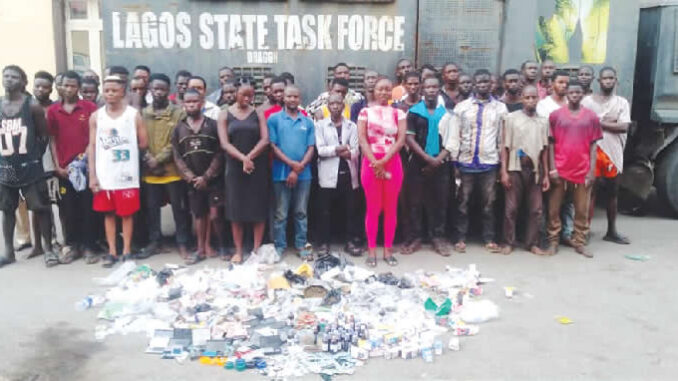 No fewer than 53 street urchins and miscreants suspected to be drug peddlers were arrested by the operatives of the Lagos State Environmental and Special Offences Enforcement unit also known as the Lagos task force during a raid of their hideouts on Tuesday.