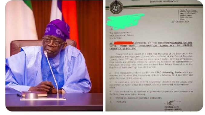 The President Bola Tinubu-led Nigerian government has begun terminating public and civil service appointments secured with degrees obtained from private universities in the Republics of Benin and Togo from 2017 till date.