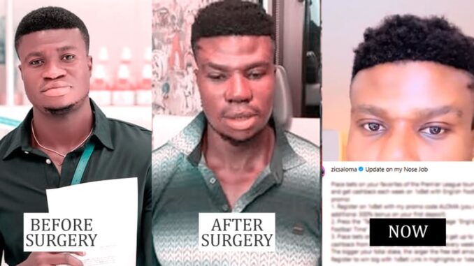 Nigerian content creator and business man Zicsaloma has been the topic of conversation ever since announcing that he was undergoing a rhinoplasty aka plastic surgery on the nose. Earlier today, pictures of a swollen Zicsaloma fresh after the surgery started circulating, and now, the actor is here with new images and a new video to show off his face now after the swollen has reduced slightly. Speaking on the whole thing Zicsaloma said: