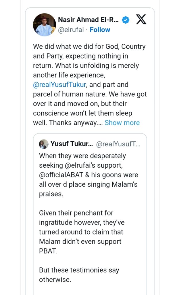Tukur tweeted: “When they were desperately seeking @elrufai’s support, @officialABAT and his goons were all over the place singing Malam’s praises. Given their penchant for ingratitude, however, they’ve turned around and claimed that Malam didn’t even support PBAT.”