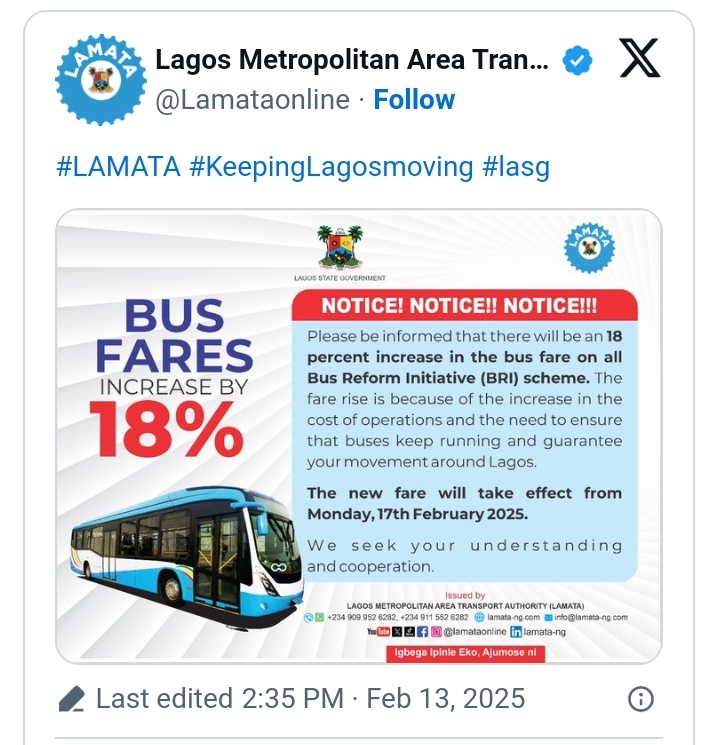 A notice posted by LAMATA on Thursday afternoon said the 18 per cent increment would begin next week.