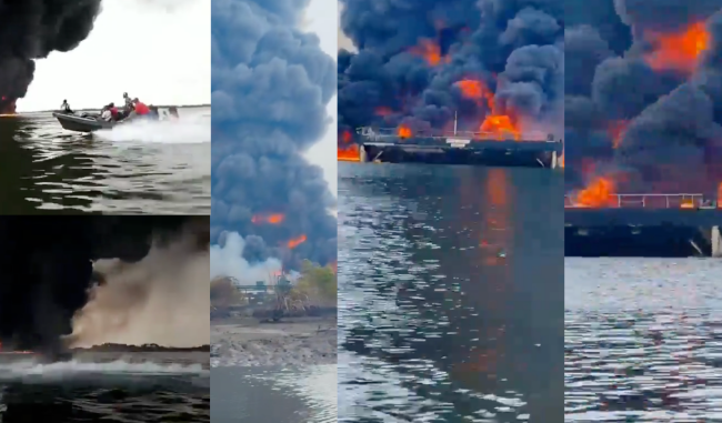 Videos circulating on social media show raging flames consuming the facilities, while locals observed the destruction from speedboats.