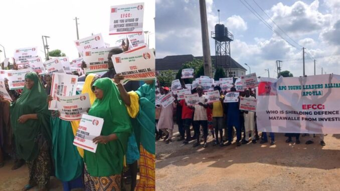 Youths under the platform of the All Progressives Congress Young Leaders Alliance (APC-YLA) on Friday took their protest to the headquarters of the Economic and Financial Crimes Commission (EFCC) in Abuja, demanding an immediate action against Bello Matawalle, Nigeria’s Minister of State for Defence.