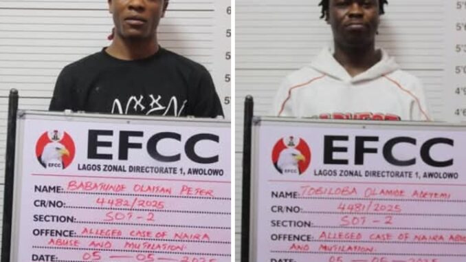 The Lagos Zonal Directorate 1 of the Economic and Financial Crimes Commission, EFCC, on Thursday, May 8, 2025, secured the conviction and sentence of the duo of Babatunde Peter Olaitan and Tobilola Olamide to six months imprisonment each for mutilation of the Naira notes.