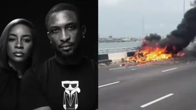 “Yesterday, around 4pm, our car caught fire on the 3rd Mainland Bridge and burnt to the ground,” the couple wrote in a joint post.