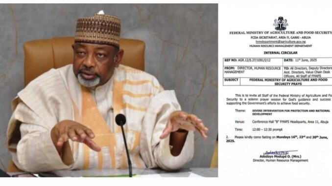 The report followed a circular dated June 11, signed by Adedayo Modupe, Director of Human Resource Management at the Ministry, announcing a three-day fasting and prayer programme intended to seek spiritual support for Nigeria’s food security efforts.