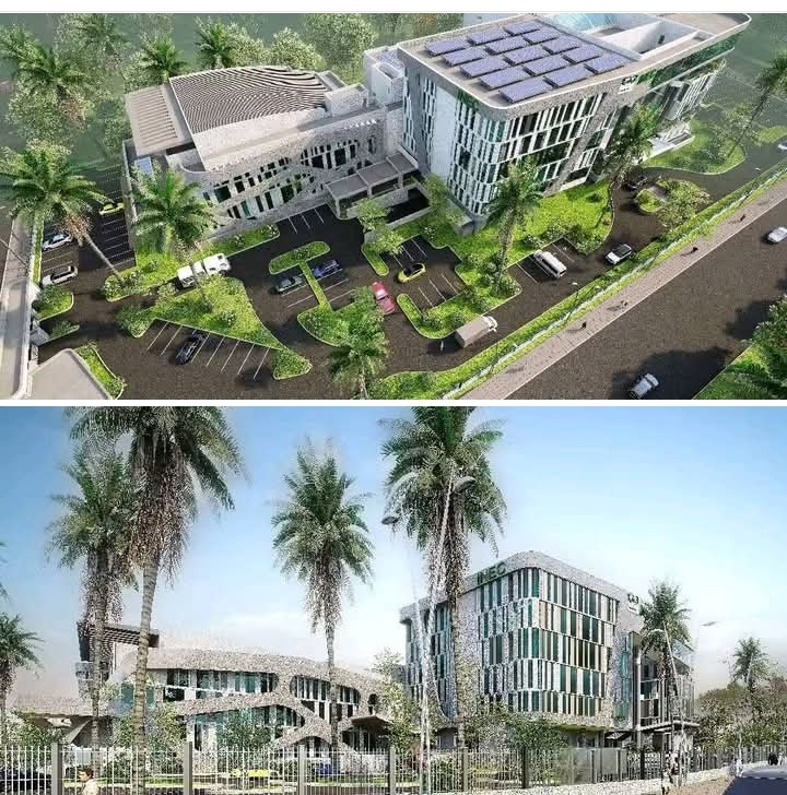 The new INEC headquarters, as showcased in the prototype images, features a sleek, eco-friendly design with solar panels adorning the roof, symbolizing a commitment to sustainability. The building, surrounded by lush palm trees and well-planned landscaping, includes modern architectural elements and ample parking space, reflecting a forward-thinking approach to electoral management.