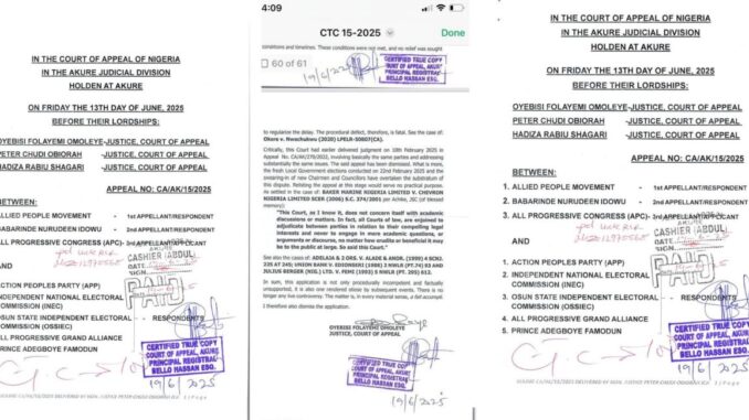 The Court of Appeal sitting in Akure, Ondo State, has dismissed the appeal filed by the All Progressives Congress (APC), affirming the legitimacy of the February 2025 local government elections in Osun State.