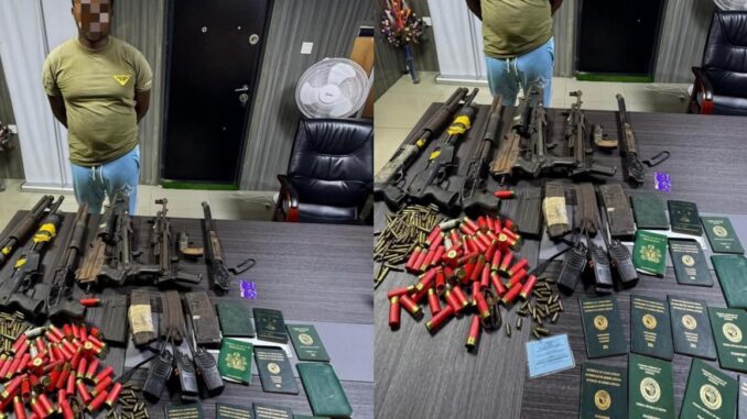 The police said the operation led to the discovery and recovery of nine (9) sophisticated firearms, over 150 rounds of live ammunition, magazines, walkie-talkies, a dagger, and nine (9) international passports belonging to different individuals.
