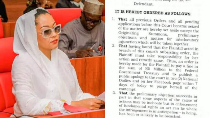 “Thus, an order is hereby made for the Plaintiff to pay a fine in the sum of N5 million to the Federal Government Treasury and to publish a public apology to the court in two (2) national dailies and on her Facebook page within 7 days of today to purge herself of the contempt.”