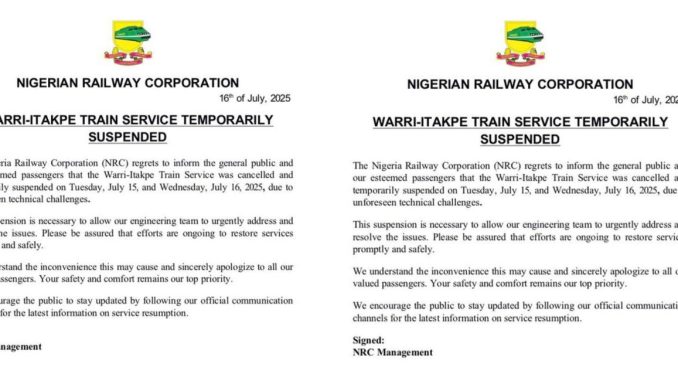 The statement partly read “The Nigeria Railway Corporation (NRC) regrets to inform the general public and our esteemed passengers that the Warri-Itakpe Train Service was cancelled and temporarily suspended on Tuesday, July 15, and Wednesday, July 16, 2025, due to unforeseen technical challenges.