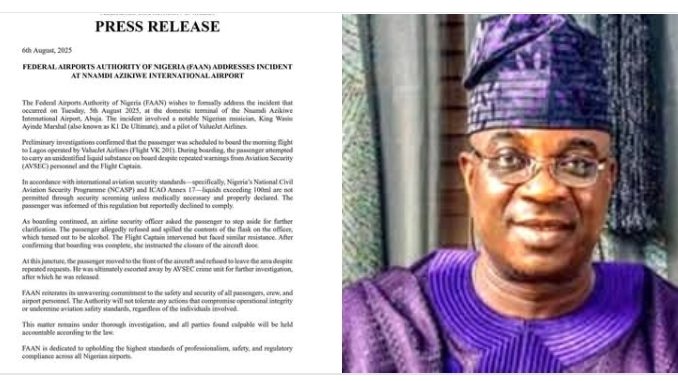Addressing the issue in the statement on Wednesday, Orah said: “The Federal Airports Authority of Nigeria (FAAN) wishes to formally address the incident that occurred on Monday, 5th August 2025, at the domestic terminal of the Nnamdi Azikiwe International Airport, Abuja. The incident involved a notable Nigerian musician, King Wasiu Ayinde Marshal (also known as K1 De Ultimate), and a pilot of ValueJet Airlines.