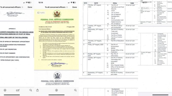 The directive, contained in an August 4, 2025 circular signed by Ndiomu Ebiogeh Philip, Permanent Secretary at the Federal Civil Service Commission (FCSC), warned that any civil servant who fails to appear for the exercise will be presumed to possess a fake appointment letter and face immediate removal.