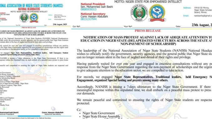 The National Association of Niger State Students (NANISS) has declared plans for a mass protest in response to what it describes as prolonged neglect of the education sector and unpaid scholarships across the state.