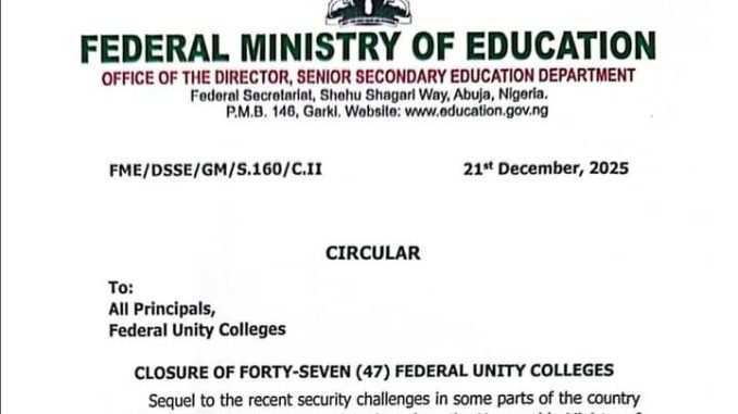 The Federal Ministry of Education has ordered the immediate closure of forty-seven (47) Federal Unity Colleges (FUCs) across Nigeria following rising security concerns in various parts of the country.