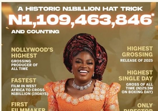 It added that she had also become “the first filmmaker to deliver three consecutive ₦1B+ films in one calendar year,” a feat yet to be matched in Nollywood.