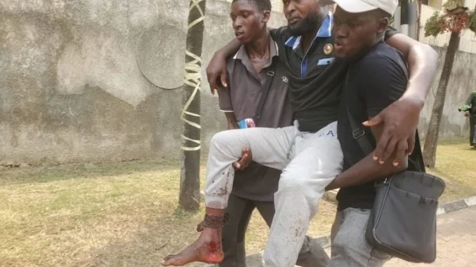Policemen at the scene of the ongoing protest over the demolitions carried out in different parts of Lagos State have begun shooting tear gas to disperse protesters who are gathered at the state House of Assembly complex, Ikeja, on Wednesday.