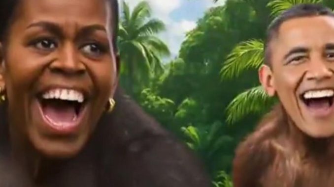 Near the one-minute mark of the clip, an AI-altered segment appears showing the Obamas’ faces superimposed on monkeys’ bodies, accompanied by the song ‘The Lion Sleeps Tonight’.