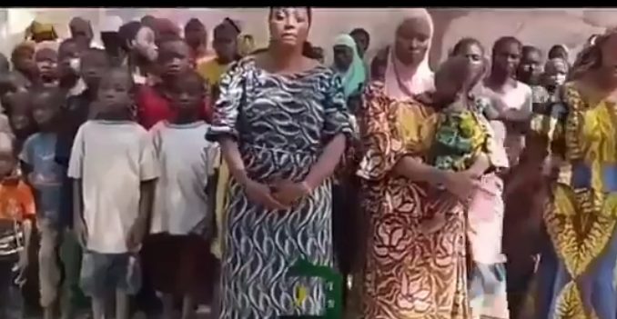 The footage shows dozens of women and children standing in rows, many of them visibly distressed.